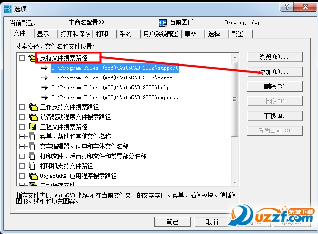2、然后点击上面的“文件”标签,点击“支持文件搜索路径”前面的“+”号,再接着点击右边的“添加”