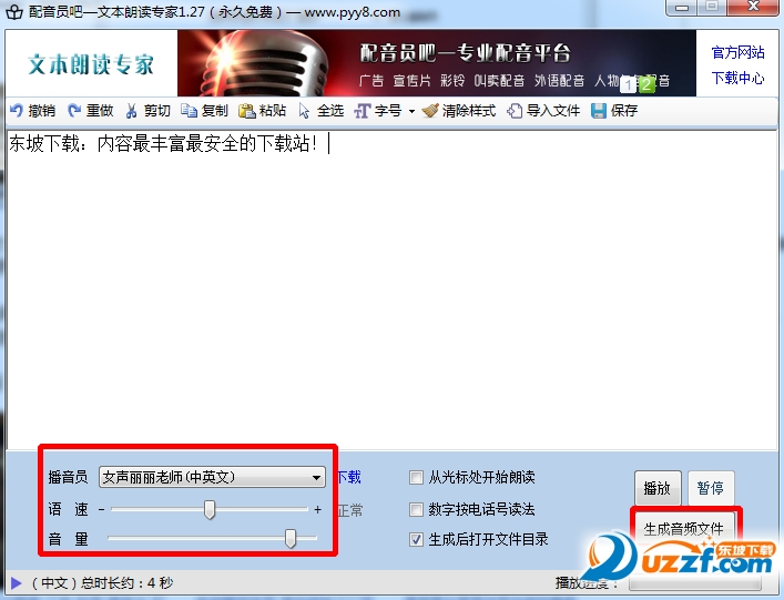 如果需要增加背景音乐、定时播放等功能,请与电脑播报专家软件配合使用,将需要播放的文本调整好语速 音量 断句等后,生成音频文件,再在电脑播报专家软件中调用即可。