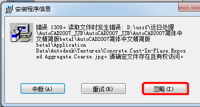 下面还有三个选项:“中断”“重试”“忽略”。直接选择“忽略”,继续下一步安装,就可以了。