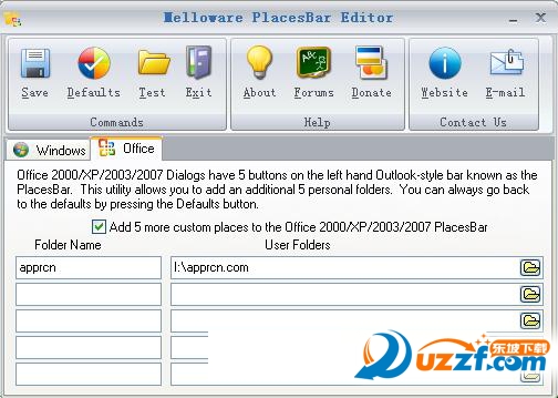 PlacesBar Editor的使用方法很简单。首先打开PlacesBar Editor,看到有两个标签,分别是“Windows”和“Office”。点击“Windows”,看到有5个可以修改的位置,我们可以通过下拉菜单来调整,当然也可以点击“Custom”然后选择自己常用的文件夹位置。