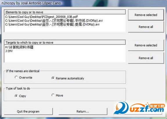 窗口上方显示的是要移动或者复制的文件和目标目录,如果想要删除的话可以先选中,再点击“Remove selected”。