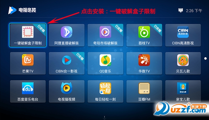 打开电视必备云os版,找到第一个应用一键"加强"盒子限制,点击开始安装,安装很快捷,完成后显示是这样的。如下图:
