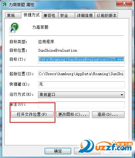 2、在弹出的属性对话框中,点击“打开文件位置”。