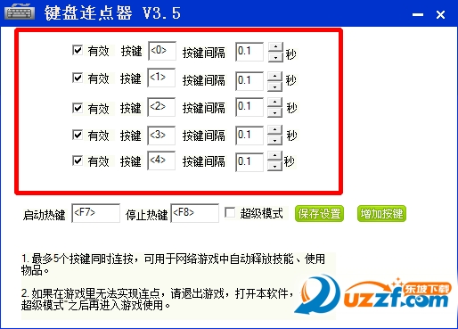 1.最多5个按键同时连按,可用于网络游戏中自动释放技能,使用物品.