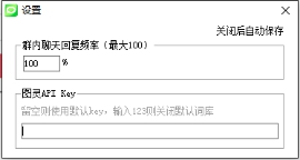 (1)群内聊天回复频率:是指机器人聊天回复的频率,如100就是每句话机器人都回复,10就是每10句话机器人平均回复一句。