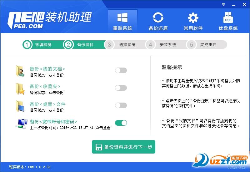 选择你需要备份的选项,你也可以什么都不理,直接点击备份资料并进入下一步。