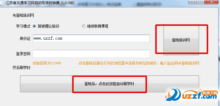 软件操作简单,只需输入身份证和密码,登陆后选择学习模式,点击自动刷学时按钮就可以什么都不用管了