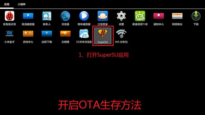 2、ROOT完成后,在小米盒子主界面的应用栏下是看不到“SuperSU”应用的,因为他变成了系统应用,所以被默认隐藏了,但是不会影响他正常工作,如果需要找到他,可以在“应用商店”—“应用管理”—“系统应用”—“启动器”这个原生桌面的程序抽屉里找到SuperSU,或者安装一个沙发管家也可以在“我的应用”里看到他。