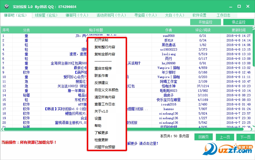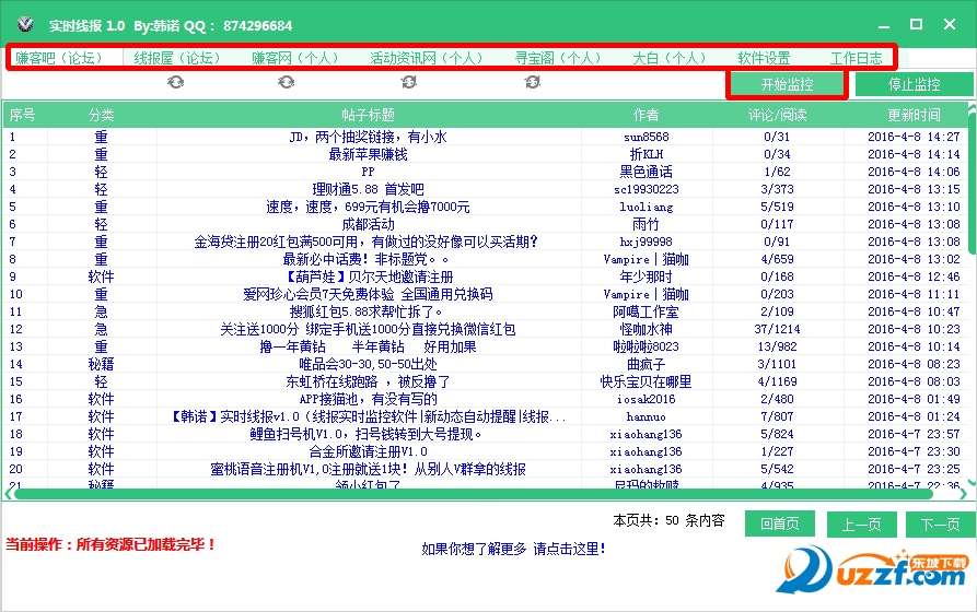 实时监控赚客吧,线报屋,活动资讯网,寻宝阁等6个网站的新帖,各种线报早知道。