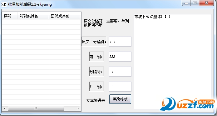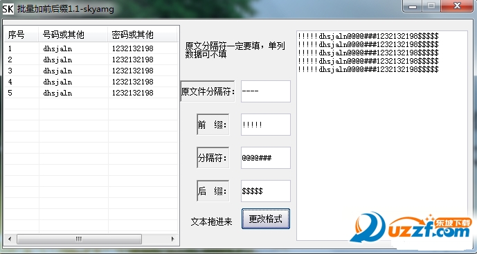有需要给自己的文本上面加各种各样的前后缀的话,现在就可以试试下面的这款sk批量加前后缀软件,支持一键批量的加你需要的各种各样的前后缀,可以更改各种软件需要的账号格式,还是挺实用的,易语言写的可能报毒!