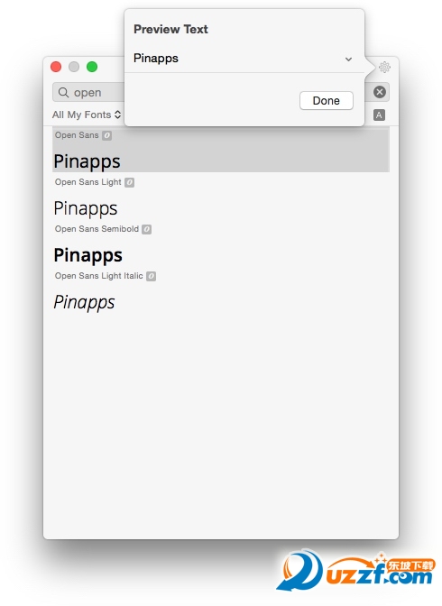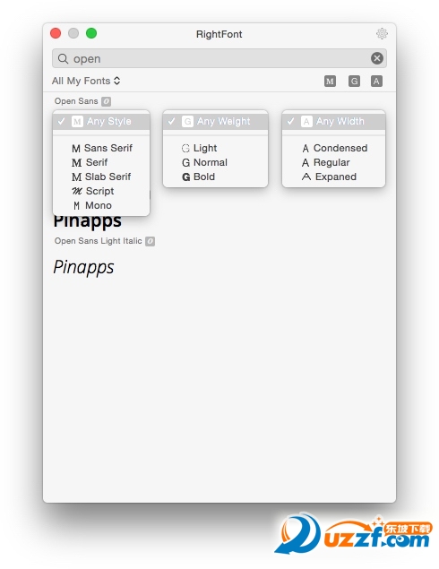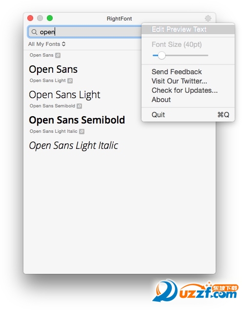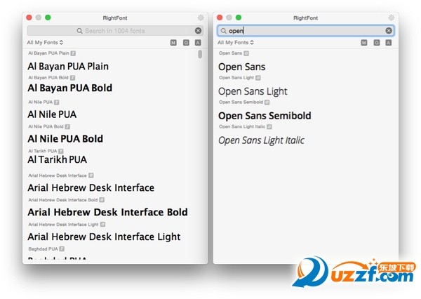 首先「RightFont」是一款非常轻巧的应用,打开后将会看到一个非常简洁的字体列表窗口。通过搜索你可以找到你所安装过的字体进行预览,比如搜索一下最近用得特别多的「Open Sans」。