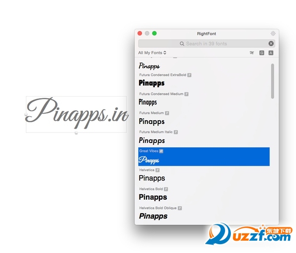 接下来则是这款应用改变字体应用使用方式的一个功能,「RightFont」与设计类应用进行了关联。如果我想为Pinapps 更换一下新的字体,在Sketch 中的选择「Pinapps.in」 这段文本,双击「RightFont」中选择的字体,设计稿中的文字将会被替换为选择字体。