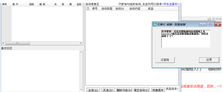 打开补丁,在打开主程序,点击过掉登陆验证,然后进去之后要点击一下还原,这样才能使用。