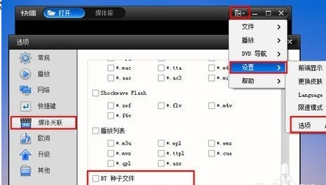 用默认打开关联文件, 在菜单选项中打开设置把BT文件的关联勾选上然后确定,就会把你电脑所有的BT文件默认快播打开了。