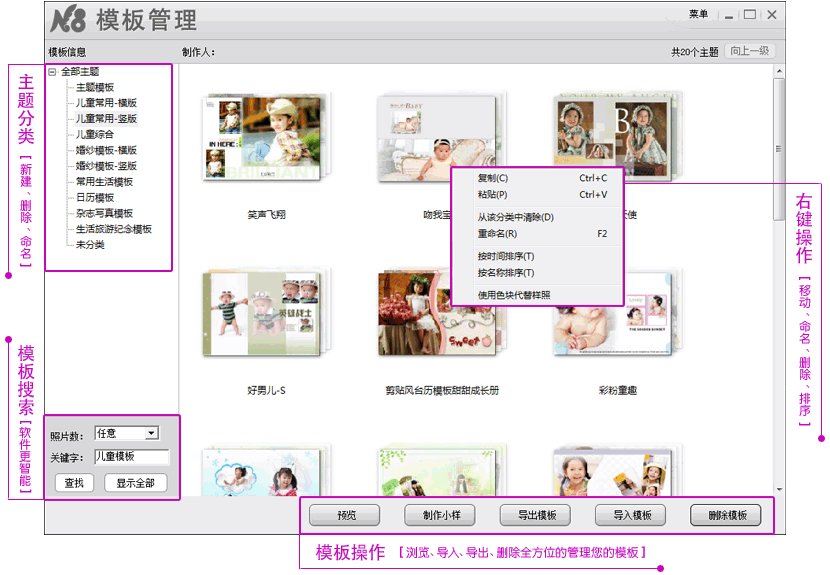 在n8模板管理工具破解版中提供了方便强大模板搜索功能,可以根据模板主题名称及模板中照片孔的数量对模板进行搜索并查找,有效的为设计师减少了大量找模板的时间,从而也提高了设计速度。