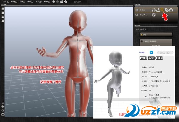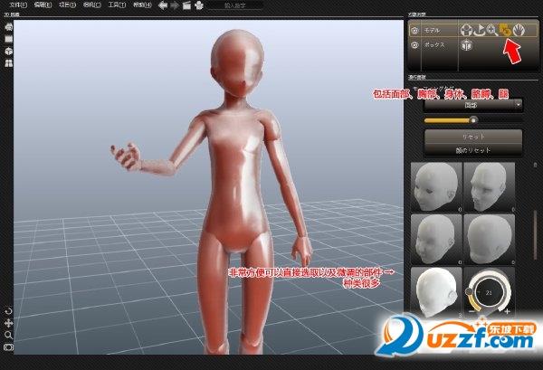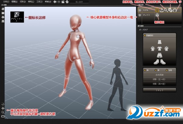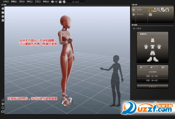 使用鼠标左键可以直接对模型的任何位置进行拖放调节。最不容易失控的调节方式是操作关节,比如脖子、手腕、腰、膝盖等等地方。非关节的部位也是可以直接调节的,操作时手的幅度尽量小一些以免模型崩坏的太厉害。所有的小细节都可以调节角度,并且软件自身有最大角度限制,不会出现脖子折断这种恐怖的事情