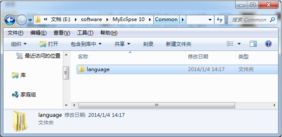 1:把汉化包里的language的文件夹复制到MyEclipse 10里面的Common文件夹里(一般里面是没有Common这个文件的,如果没有自己创建一个)。看准了 在MyEclipse 10同级下也有一个Common文件我们汉化整个过程都不要动它