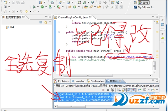 3:运行MyEclipse软件创建一个项目,在项目里面建立一个CreatePluginsConfig类,把上面的代码复制进去,记得修改你的插件路径。
