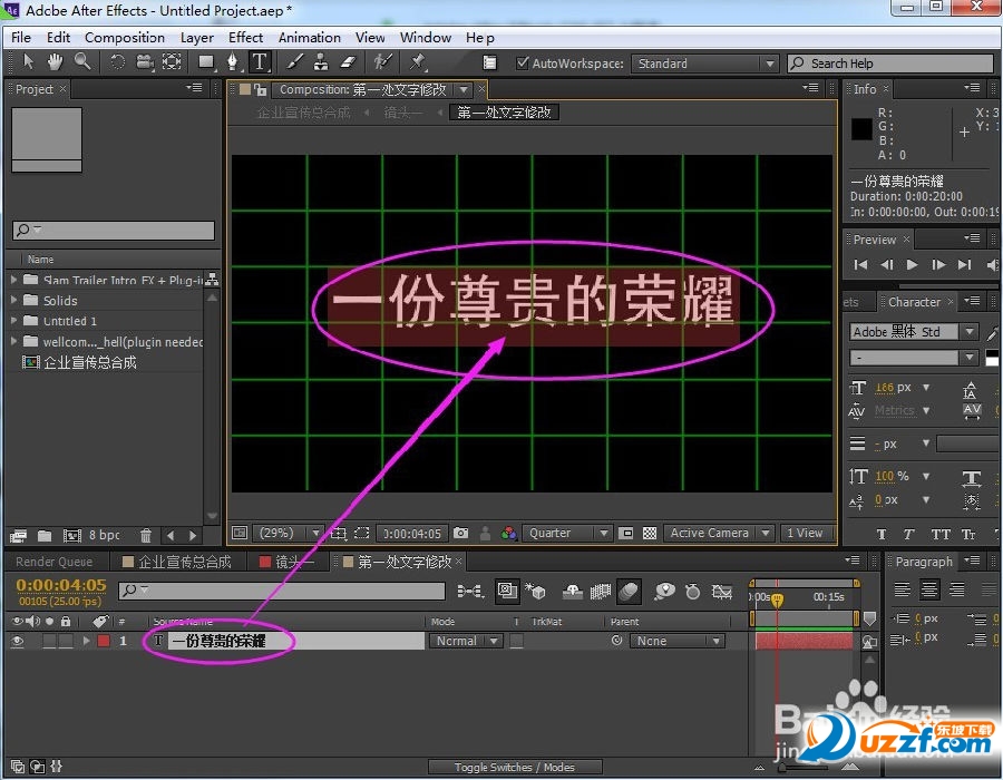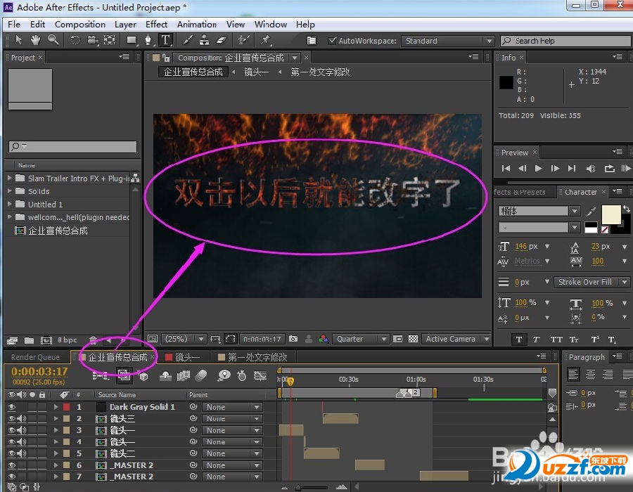 其它文字的修改方法与上面相同,修改完所有需要修改的内容后,回到主合层,然后渲染输出。(如果不会渲染,请到我之前写过的经验中查看: AE工程项目渲染输出为视频文件)