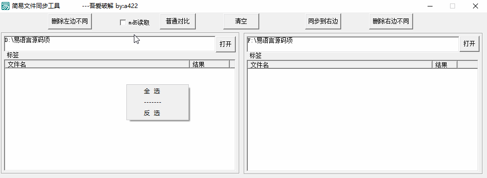 快速的备份你需要的一些数据,有需要在自己的电脑上进行备份以及同步的朋友,可以试试下面的这款只支持同步到右边窗口,覆盖方式复制到右边文件夹的简易文件同步工具!