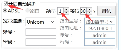 先勾选“开启自动换IP”,然后设置频率(注册几个换IP),再设置等待时间,等待多少秒,具体看你手动切换IP的速度,一般30s我感觉差不多了。宽带账号和密码都留空,一定留空,然后完成后面的设置就可以开始了。等到注册完一定个数,软件会提示你该换IP了,这时你自己通过手动去切换IP就行了。