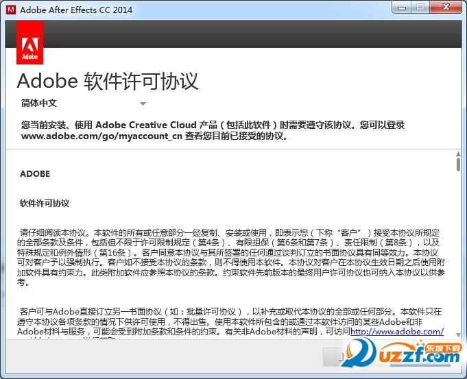 安装选项,默认全部勾选,几个功能模块大致就是:After Effects CC 2014预设模块、Photoshop Camera Raw插件、然后就是Adobe自带的字体库,可以自选安装
