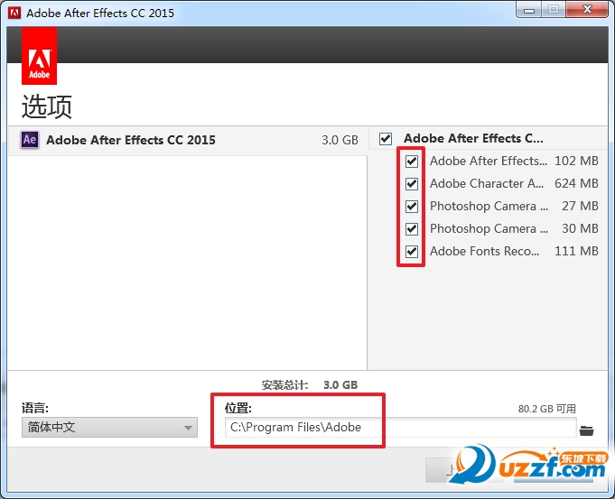 整个AE CC 2015完整安装是近3GB的空间,右侧的功能插件可自由选择安装,但是推荐全部安装,然后安装位置默认C盘,可以修改