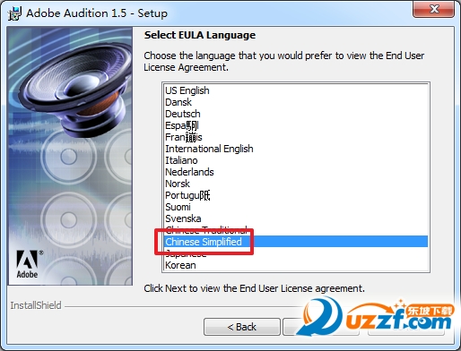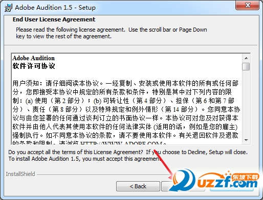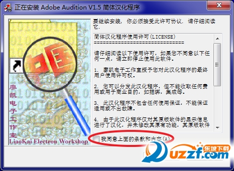 Audition 1.5安装成功后,还需要进行汉化,运行汉化补丁,勾选接受许可协议,然后点“下一步”