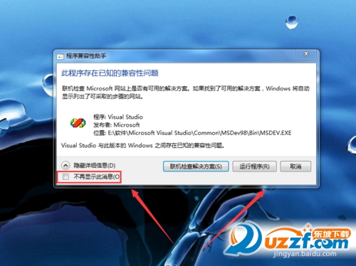 一般来说,Microsoft Visual C++ 6.0是一款windows xp或者win2003版本的软件,在我们win7、win8、win10版本上面运行都是会出现这个提示的,这里我们点击勾选不再提示,然后点击运行程序就可以了。