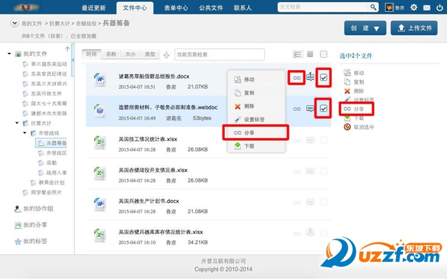 1. 选中您要生成分享链接的文件(可多选),点击右侧菜单或鼠标右键弹出菜单中的“分享”(分享单个文件也可点击该文件右侧的锁链样图标)