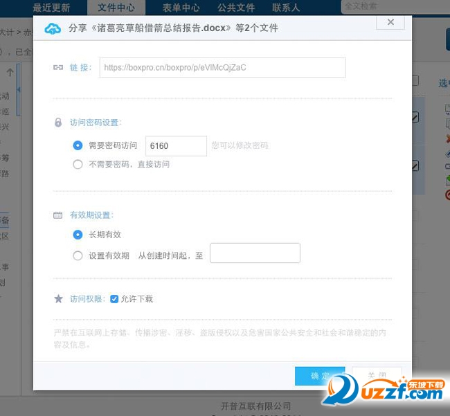 在访问权限处,您可以设置该分享链接中的文件是否允许被下载,默认勾选为允许。