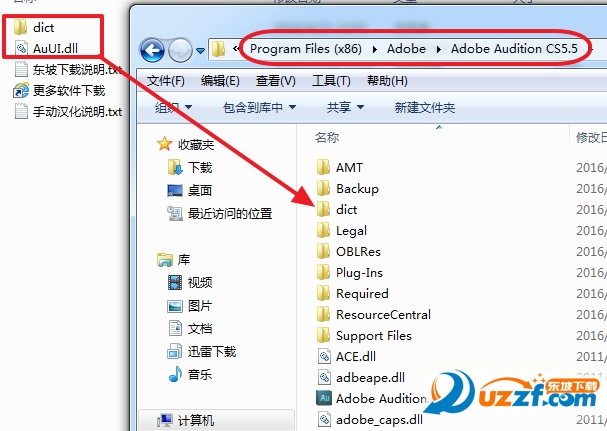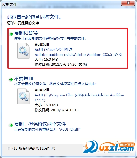 补丁就不用去安装了,直接找到 Adobe Audition CS5.5 的安装位置,然后把补丁覆盖进去就可以了