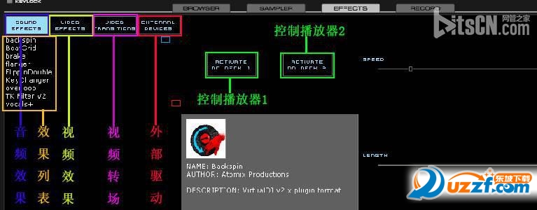 效果区的下拉菜单可选择效果种类,PARAM1,2分别控制效果显示区的可调节参数的1,2(有些效果是没有参数可调节的)比如选择了BACKSPIN效果,PARAM1就是控制SPEED,PARAM2就是控制LENGTH