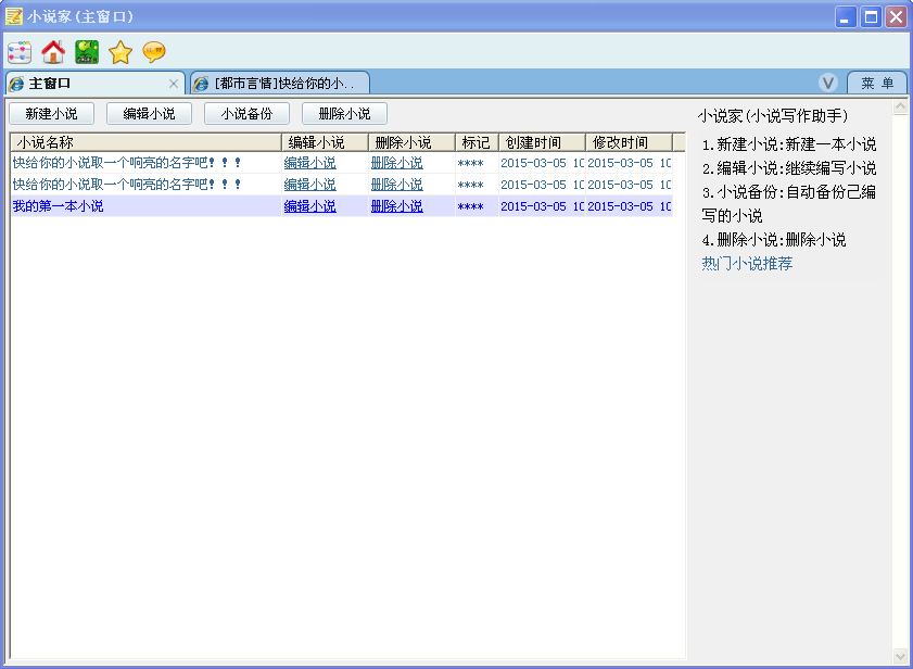 小说家(小说写作工具)可以帮助你方便的写作小说,该软件可以帮助你更方便的进行小说写作。软件提供了各类增删查改功能,可以很方便的编写小说,灵感记录,备份小说数据~需要的朋友就下载把~