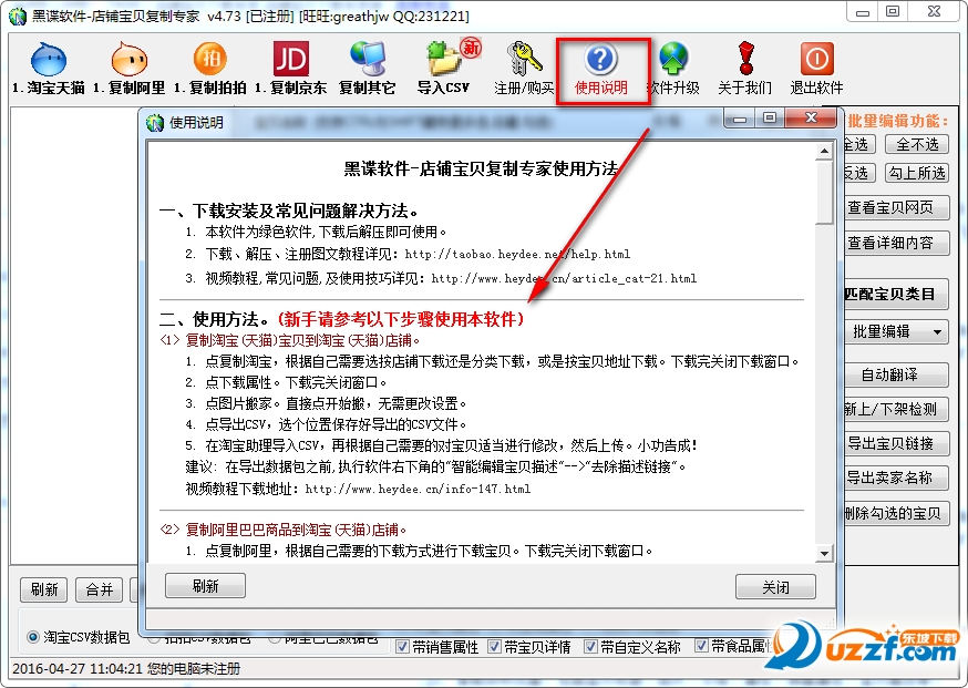 1、点复制淘宝,根据自己需要选按店铺下载还是分类下载,或是按宝贝地址下载。下载完关闭下载窗口。