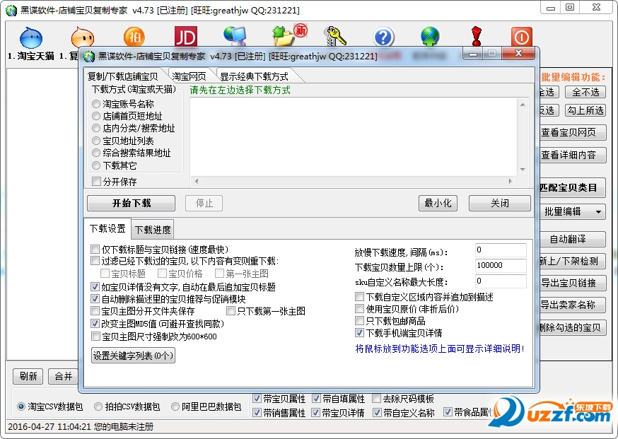 开网店的朋友经常需要编辑自己宝贝的图片的相关信息,自己一张一张去上传会很麻烦,这种店铺宝贝下载专家第三方软件就非常好用,用批量下载相关信息,批量导入到自己的网店,支持淘宝、拍拍、京东、阿里巴巴,小编这里带来的是店铺宝贝下载专家完美破解版。