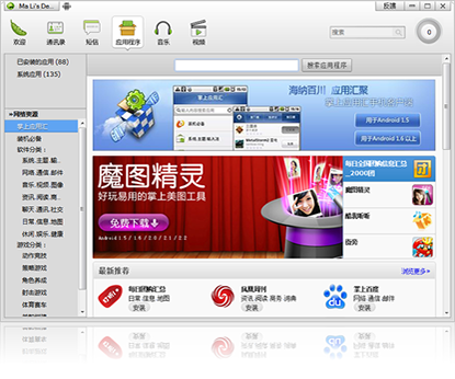 应用程序安装 —超过1000种Android手机应用网络直接安装 —本地APK文件双击安装
