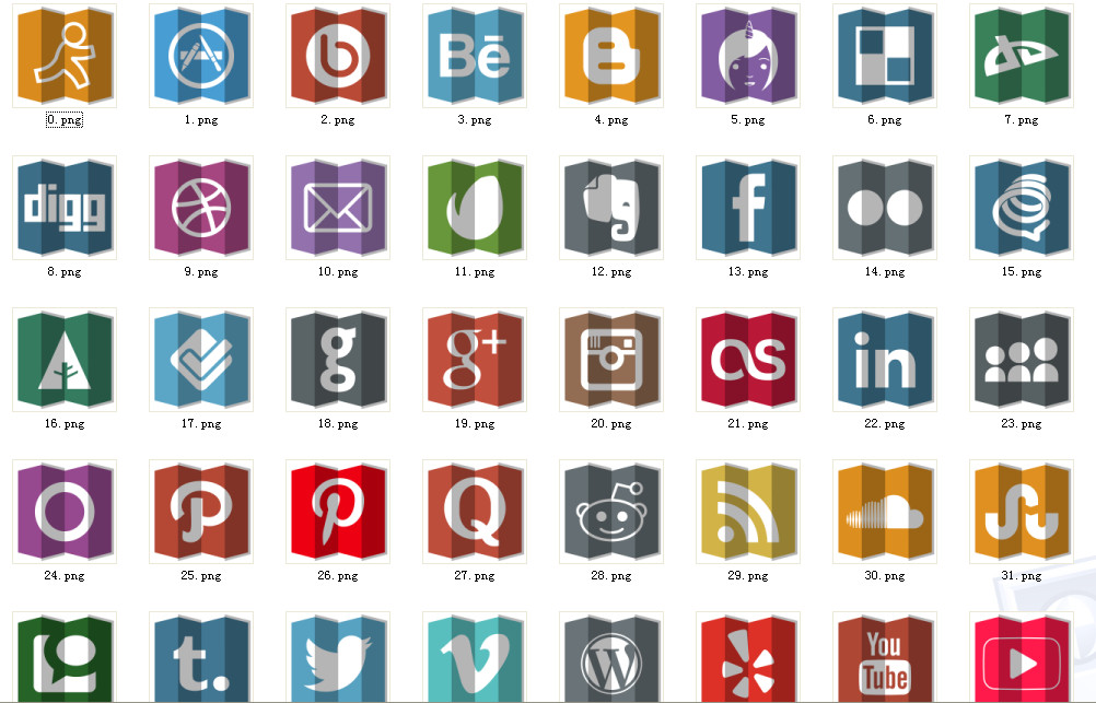 你想拥有属于个人的个性社交媒体软件图标吗,这里有49款折叠社交媒体图标,包括APP、DIGG、YOUTUBE等图标,全部都是折叠型的,对平面设计、美术设计、网络爱好者来说,一定非常有用,快来换掉一成不变的图标,享受新的视觉体验吧!