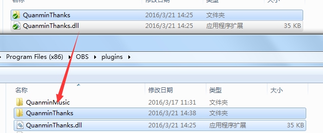 如果为32位,请将下载下来的全民TV答谢水友.rar解压将32位文件夹里的QuanminThanks.dll文件和QuanminThanks文件夹复制到Program Files(x86)的OBS的安装目录的plugins文件夹下。