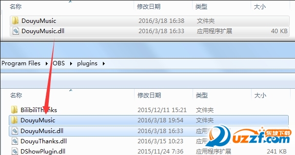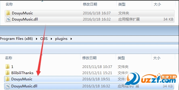 如果为64位,请将下载下来的小葫芦斗鱼TV点歌插件.rar解压将64位文件夹里的DouyuMusic.dll文件和DouyuMusic文件夹复制到Program Files的OBS的安装目录的plugins文件夹下。