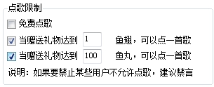 (b)关于点歌限制,点歌限制分为两种,一种是任何人都可以点歌,即任何用户都可以在直播聊天框中输入点歌语法进行点歌