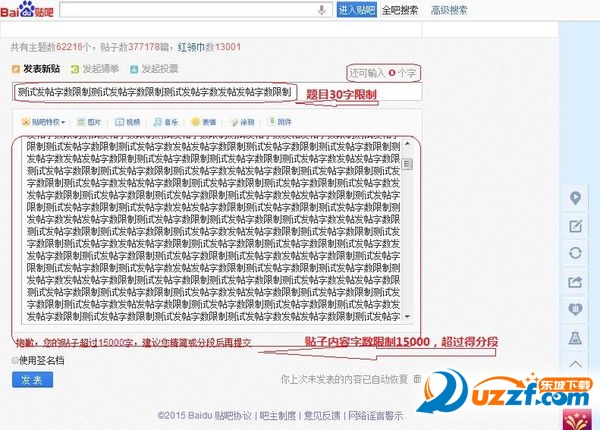 1、发表主题贴,题目限制为最多30字,帖子内容为15000字,超过要分段。