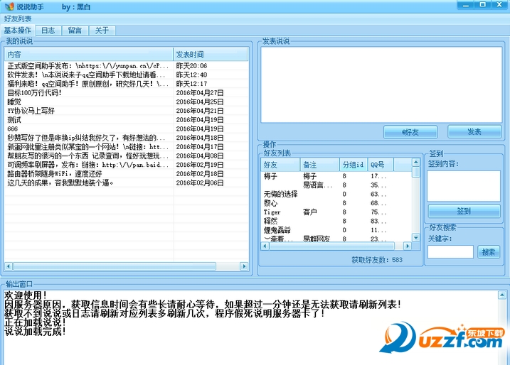 黑白qq空间说说助手是一款免费的qq空间小工具,可以批量发表说说,@好友,自动签到,留言,写日志,功能强大,欢迎来下载使用!