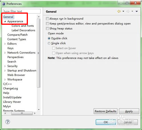 2、点击后在下拉菜单中找到preferences,然后在左边的菜单栏中找到general,appearance在general展开后的第一行,点击展开appearance