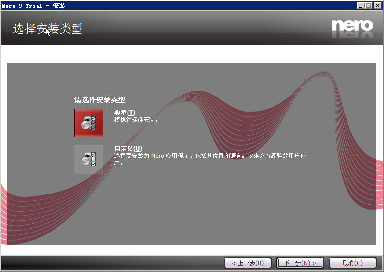 可以选择典型安装,和自定义安装,如果你是初次使用nero9.4.44.0b中文破解版,建议使用典型安装,这样子系统会自动给你配置好环境,安装必要的组件。