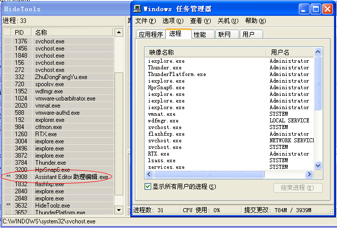 标记的为我要操作给大家看的,上图为没有隐藏的时候,在进程管理器内是可以看到的。