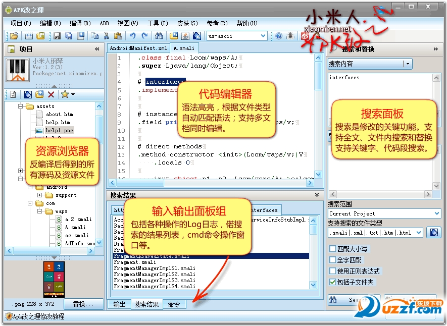 APK改之理(APK IDE)是一款可视化的用于修改安卓Apk程序文件的工具,集成了ApkTool、Dex2jar、JD-GUI等Apk修改工具,集Apk反编译、Apk打包、Apk签名,支持语法高亮的代码编辑器,基于文件内容的关键字(支持单行代码或多行代码段)搜索、替换引擎,打造成可视的、一体化的APK修改工具,从而大大简化Apk修改过程中的繁琐操作,修改更轻松。