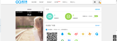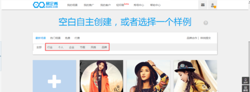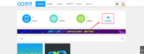 使用账号登录到易企秀网站之后,在我的场景里可以找到【创建场景】选项,如下图红框位置所示。