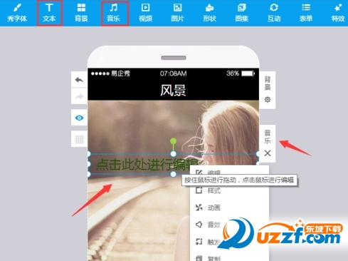 点击上方菜单栏里的【音乐】,【文字】等功能选项,可以在制作的文案里添加音乐背景,文字等,选择添加的文字,也可对文字进行编辑,设置动画模式等,如下图所示。