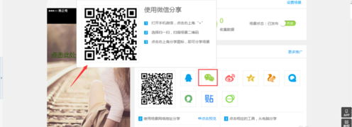 自己创建的场景可以通过扫描二维码分享到QQ,微信,微博,空间等地方,比如我们想分享到微信上,可以点击微信,弹出二维码,使用手机扫描该二维码即可,如下图所示。